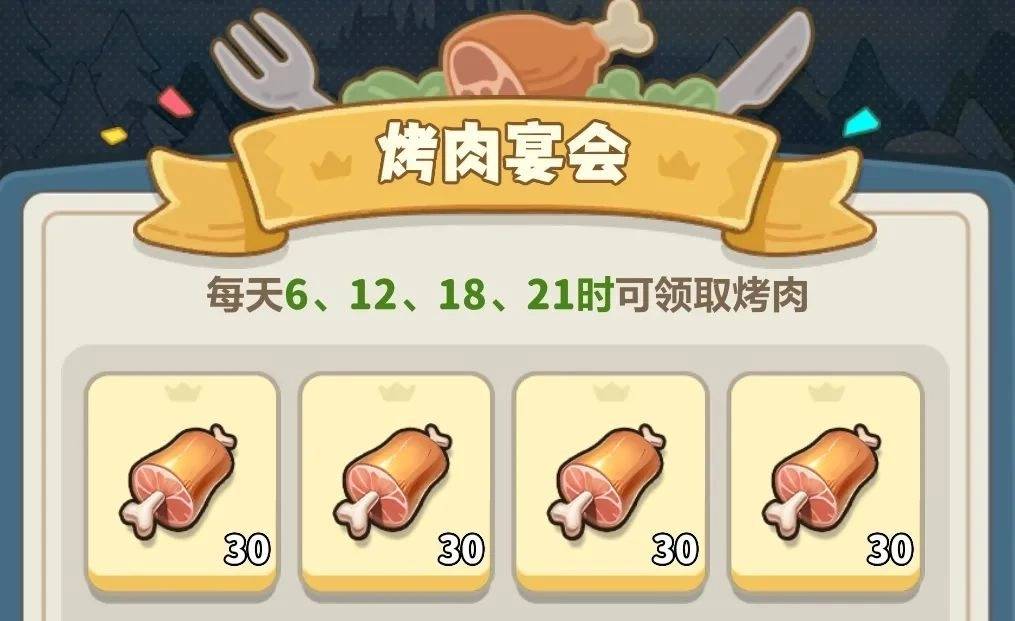 体力不够用?记得前往食堂领取烤肉,每天6、12、18、21时四个时间段可领取烤肉~
