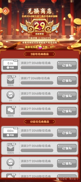 玩家游戏中可以通过挑战关卡来收集2048道具,并且还要达到特定的等级,接着进入兑换商店中,消耗2048道具就能获得相关奖励了。