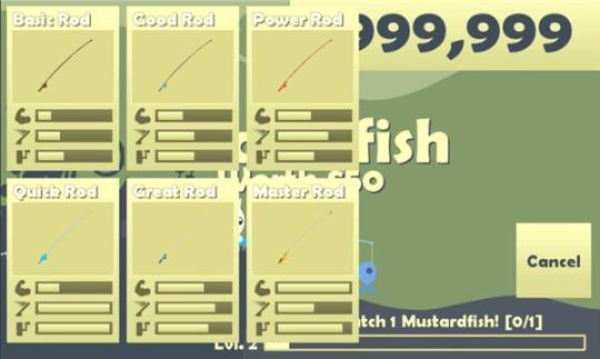 1、游戏中设有丰富的渔具供玩家挑选,而且玩家能够免费挑选形态各异的鱼,种类总计超10种。