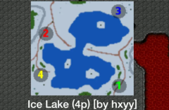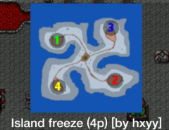 鉴于场地开阔且矿点繁多,机动性较强的陆军与空军,适合用于抢夺或打击资源点。开局时,从机械场派出小机甲,陆地工厂生产小坦克或主力坦克,空军基地出动轻武装直升机或武装直升机,这些都是不错的策略。在上图所示区域,陆地面积较大,空军机动性优势显著,能有出色表现。然而在下图,陆地面积较小,不足以充分发挥空军优势,综合性价比等因素,最佳打法是开局由二级工厂生产主力坦克。 (备注:沙漠地图与island freeze地图的面积大小,可视为空军及部分低科技兵种使用效率的临界点。从临界点往上,小坦克这类低科技但产出效率高的兵种以及空军,开始适宜投入使用。) (具体原因1:低科技兵种产出条件要求低,能快速投入战场,干扰敌方建造者建造野矿,或压制击杀敌方野外侦查者,让己方建造者安心建造资源点,获取经济优势。但过多制造低级兵种,会影响二级工厂主力坦克的产出速度,使其难以快速抵达前线资源点,进而可能被敌方反制。具体情况需结合地图大小判断,上述地图给出了一个临界参考值。) (具体原因2:地图面积越大,矿点越多,空军可控制骚扰的区域就越广。但空军存在劣势,其性价比大多低于陆战对空兵种。若资源点少且集中,当重坦等主力陆军抵达矿区获取经济后,再出动空军进行反制,很可能陷入劣势,甚至基地也会受到敌方坦克集群的威胁。)