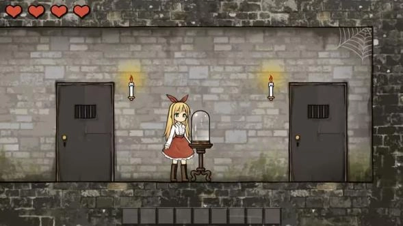 左上角的四颗♥代表生命值,扣完后会重新回到存档点。出生点房间为右边,中间的玻璃罩是存档点和回想室,存档后可进入左边的房间。