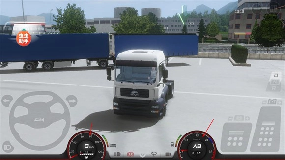 3、关闭制动器后点击最右边的油门按钮让卡车前进,点击按钮的位置越高速度越快。油门旁边的是刹车按钮,使用方法和油门一样。