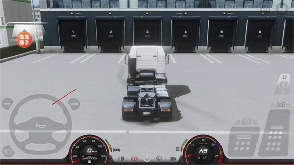 5、屏幕左侧的大圆盘是卡车的方向盘,可以操控卡车转向,方向盘中间的喇叭按钮是鸣笛。