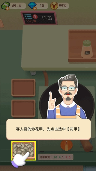 5、根据客人的需求来做菜,这个客人需要的是炒花甲,就先点击花甲,把花甲放入锅中。