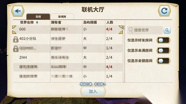 6、列表上方的两个可勾选选项,能帮助你方便快捷的加入到好友的游戏中,或者找到允许加入的房间。