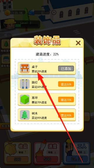 2、收集材料安排工人:在任务中通过移动步数获取材料,根据材料类型和建造需求,分配对应工作,体力好的工人搬运重物,细致的工人负责搭建细节,确保高效推进。