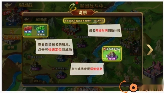 1、军团战开始前十分钟,玩家可进入本军团报名的城池准备战斗。开战后会预留一段时间供军团成员加入战场。