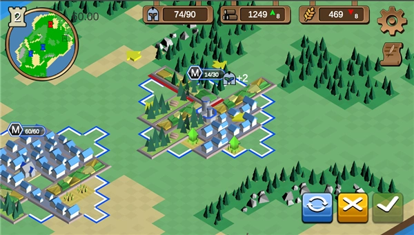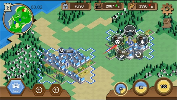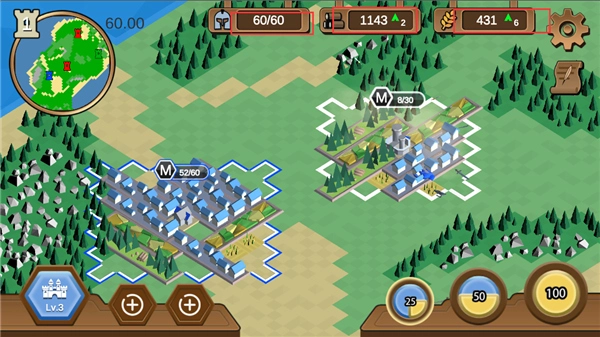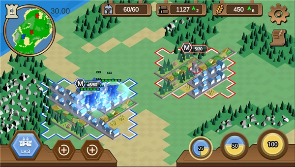 木材可用于建筑的建造与升级;粮食则是产出士兵的关键资源;兵营专门负责训练士兵。玩家需借助这三种建筑以及现有的各类资源,仔细权衡并规划发展方向,从而制定出最优的策略方针。在游戏进程中,除了自身的发展建设,通过军事战略实现版图扩张,同样是玩家发展壮大的重要途径。基于沙盒理念构建的超大型地图,极大地方便了玩家进行军事部署。玩家能够在这片广袤的地图上,与其他势力争夺中立资源,逐步发展,最终成为这片大陆上最为强大的势力。