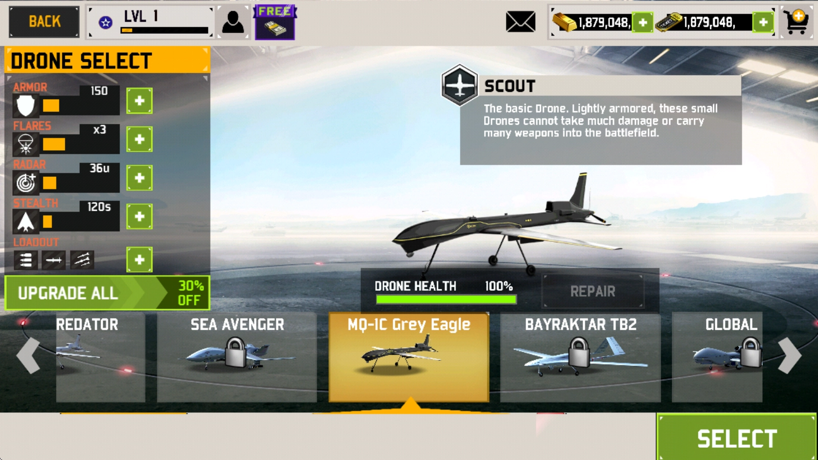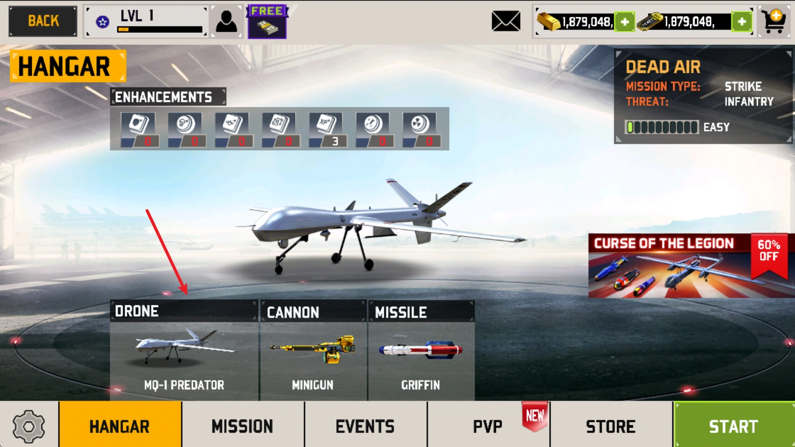 2、在 “HANGAR” 页面中,可从提供的选项里挑选适合的无人机,确定本次战斗使用的装备。