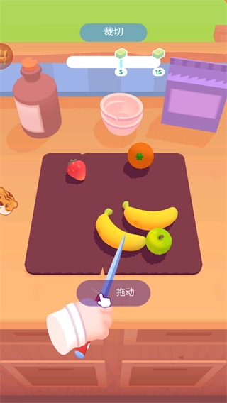 3、根据进度条放入完食材之后,滑动屏幕可以开始用刀切割制作;