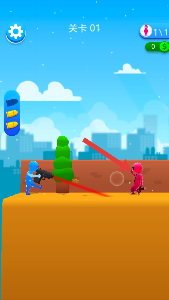 1. 启动关卡01,操纵蓝色小人对红色敌人进行射击,通过战斗获取金币,积累起来的金币能够用于角色或者武器的升级,为后续关卡提供助力。