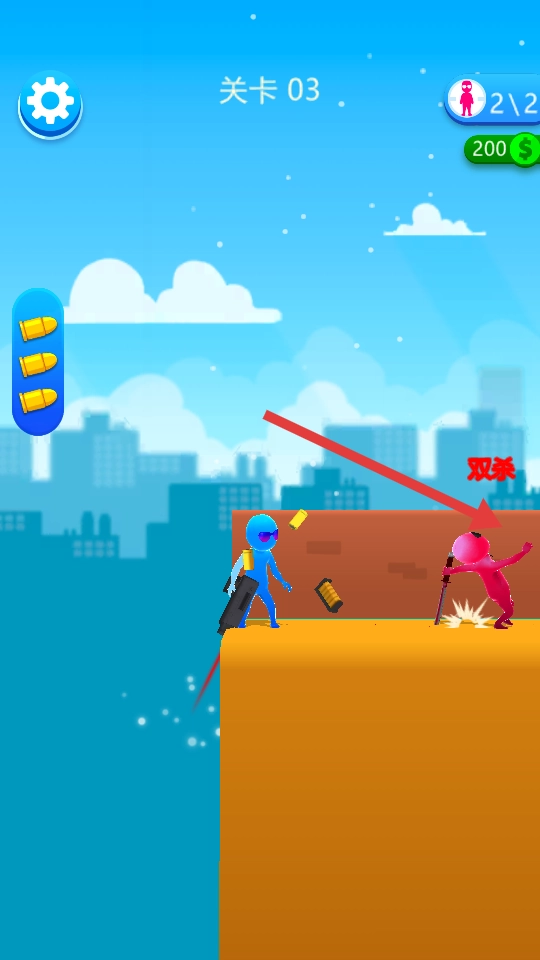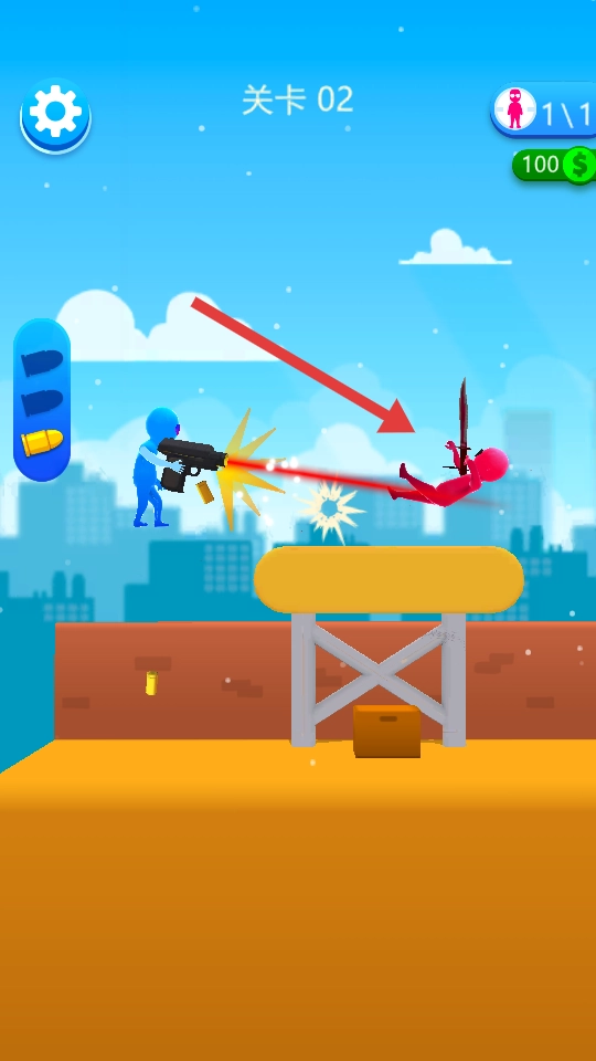 2、闯关卡02,蓝方射击红方并跳跃障碍,胜利得资源,用资源升级攻击的属性,提升伤害效率的通关。