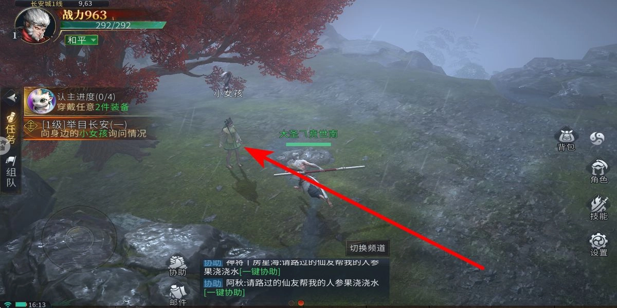 3、领取任务后,进入游戏场景,寻找身边附近的小女孩,承接“举目长安一”任务,依照指引询问相关情况,开启前期成长剧情任务线。