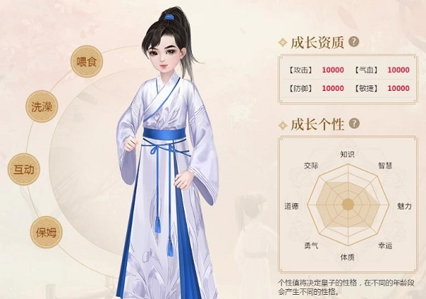 (2) 除了喂食、洗澡,还存在多种互动游戏,像抱抱、玩拨浪鼓、翻花绳等等,如此一来,小主们平日里也能够陪着皇子嬉戏。