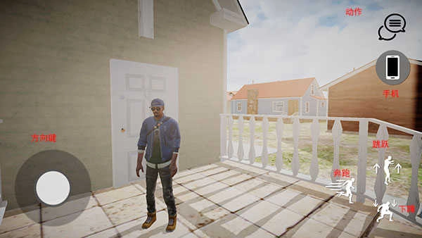1、进入游戏后能看到这些,像摇杆方向键、奔跑、跳跃、下蹲,还有动作以及手机。