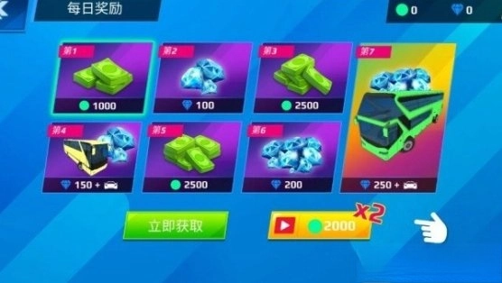 3.每天登录游戏可以领奖励,连续签到7天还能拿豪华大巴和钻石。