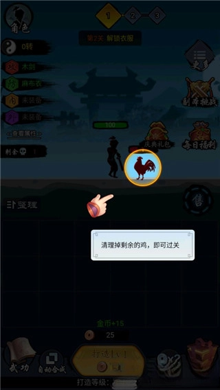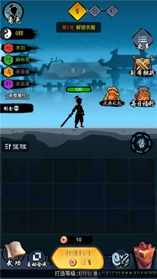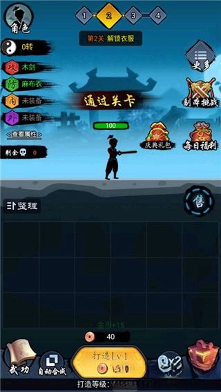 3.随着修炼等级不断提升可以解锁更多的武器与装备,提供攻击力与防御力的同时还提高赚钱的数目。