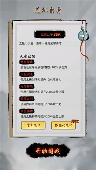 1.首先进入游戏选择随机出身,点击强化随机,就可以拥有SSR,这里无需观看广告就可以免费获取。