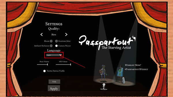 游戏里的每一种场景及画画方式,都由玩家亲自操作,可通过NPC来购买一些画纸画笔等等。 玩家可在游戏中更改英文标识,改为中文版本,更改方式为主,界面左边框倒数第2个,点击,可直接下拉框架,选择中文后再去使用。