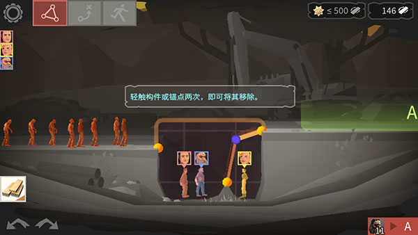4、接下来按照下方说明建造符合橙色引导线的桥梁支架,用手指从橙色锚点开始拖拽建筑构件。