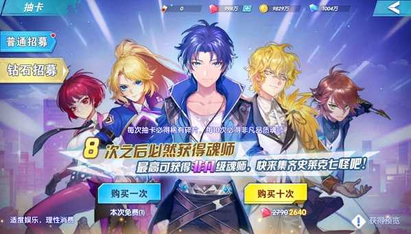 抽卡系统是玩家获取魂师的途径之一,主要分为普通招募和钻石招募。今天给大家介绍一下钻石抽卡。钻石招募可通过消耗红钻进行抽取,钻石招募每次抽卡必得稀有碎片,每10次必得非凡品质魂师。钻石招募每日最多可进行50次招募。