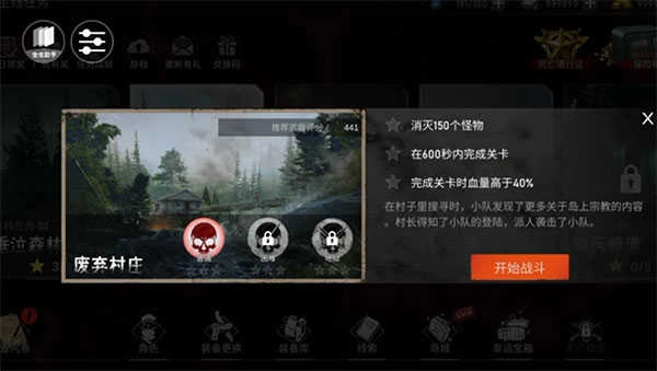 2、然后可以在右侧看到此关的任务:消灭150个怪物、在600秒内完成关卡、完成关卡时血量高于40%,点击“开始战斗”。