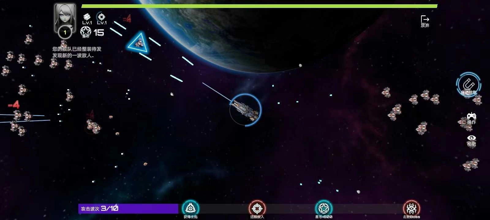 3、一共有十波敌人,玩家全部击败之后,即可成功;进入游戏后,战舰会自动识别敌军进行射击;