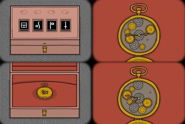 15、密码盒上的密码,对应着四个方向的星座。向左转身,便能瞧见地上的密码盒。输入密码打开后,里面有一块怀表。打开怀表,通过调整黄色齿轮的位置,让所有齿轮都转动起来。