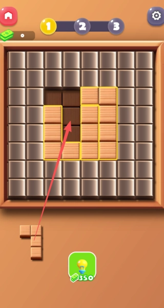 2、在应对木块拼图关卡时,首先仔细分析待放置木块的形状,接着认真观察棋盘上空缺区域的轮廓,如同图中箭头所指示的那样,尝试将木块与空缺区域进行匹配,从而逐步完成填充。