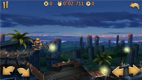 这是一款横版的摩托车竞速类游戏。其操作并非采用重力感应方式,而是运用虚拟按键。虽说操作手法或许略显平常,然而玩起来趣味性十足。在屏幕下方设有四个虚拟按键,左下角的两个按键用于控制摩托车的重心,右下角的两个按键则负责控制摩托车的前进与后退。整体操作极为简单,玩家能够迅速掌握。