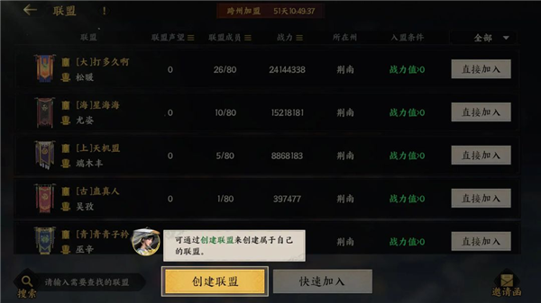 当主城等级满足要求,并成功建造“四方馆”后,便能选择创建联盟,或者加入已有的联盟。若选择创建联盟,需承担起盟主的责任;当然,也可挑选加入一个活跃的联盟,与大家一同奋进!