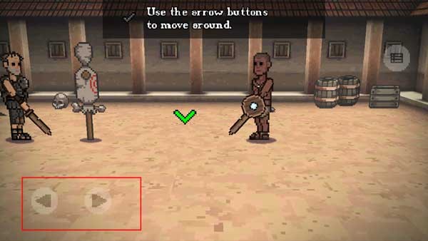 2、接下来就是新手引导,第一步就是用左边的左右按钮控制角色的移动,当玩家到达绿色指示箭头位置时开始下一步。