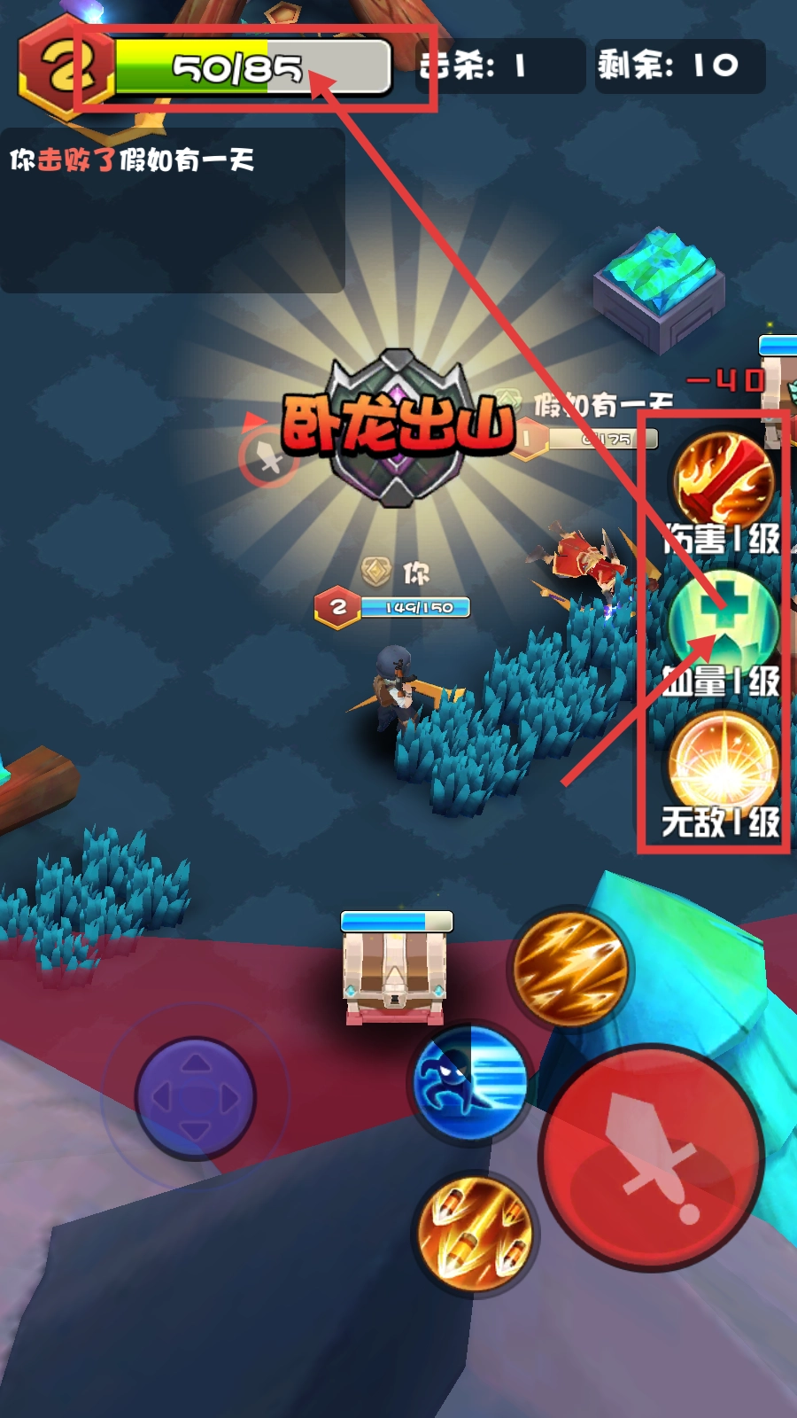 3、完成升级后,挑选【血量1级】等技能,以此增强生存能力与战斗力,推动【50/85】经验条的进度。