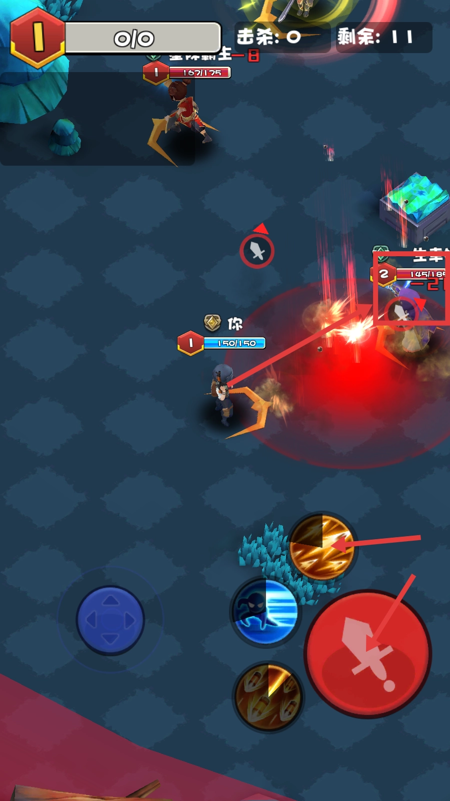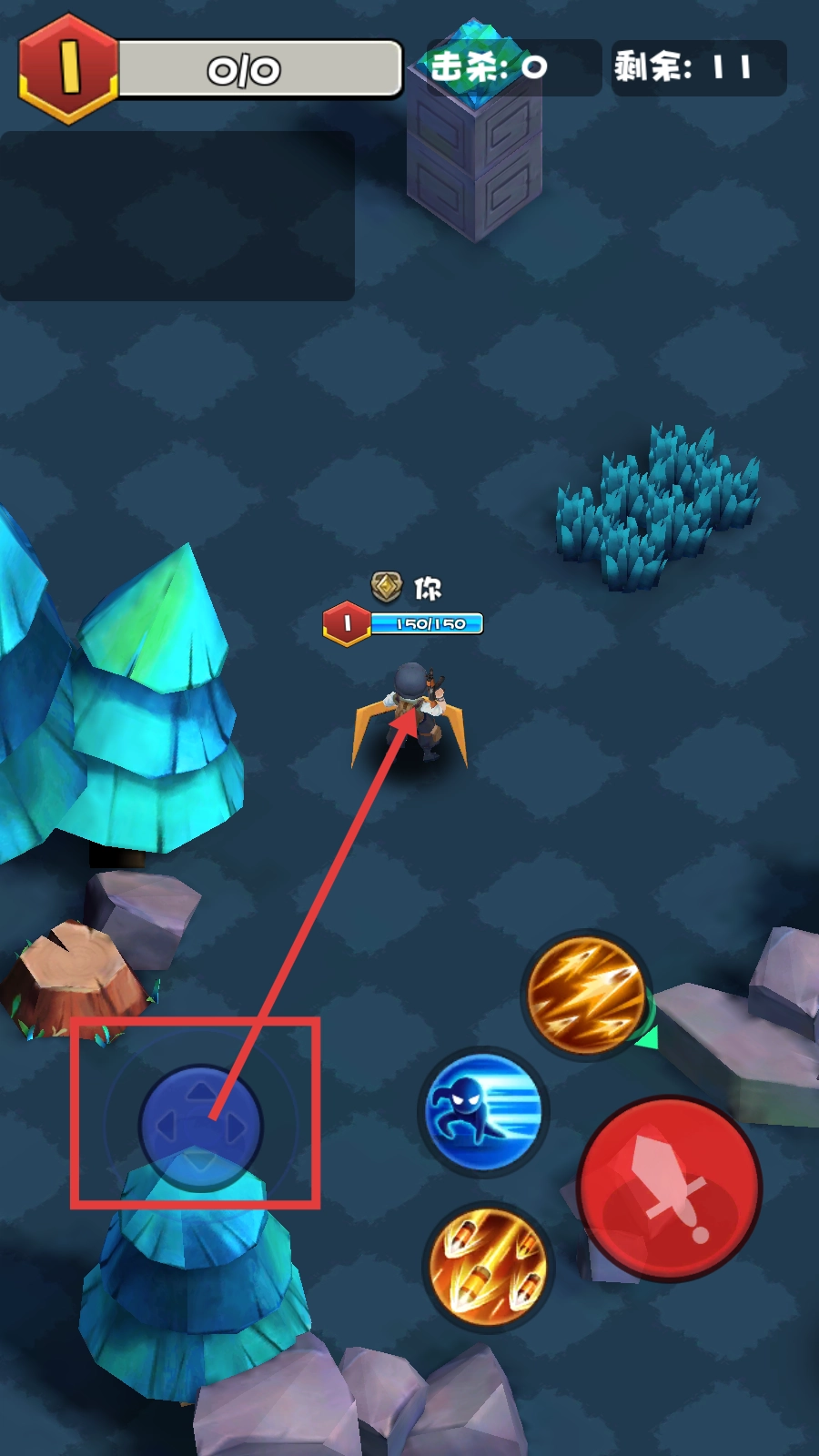 1. 通过操控蓝色方向键来移动角色,留意【击杀:0】与【剩余:11】这两项信息,待熟悉操作之后,再开启战斗。