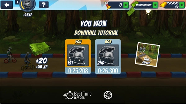 5、当你成功完成关卡,不仅能收获金钱与经验奖励,还能够查看自己和对手通关所花费的时间。此外,你还可选择【VIEWREPLAY】来观看游戏回放,回顾自己的精彩表现进行复盘。