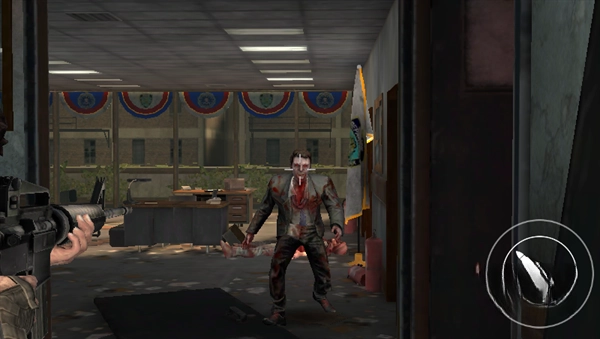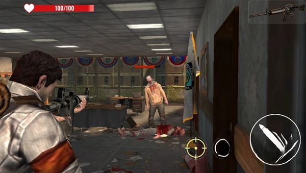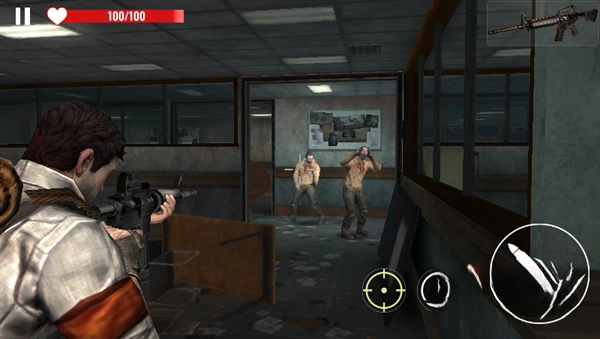 2、当发现前方出现僵尸时,迅速瞄准,然后持续点击右下角的【射击】按钮,一直到僵尸的血量降为零。在此过程中,要时刻留意左上角自身的生命值情况。