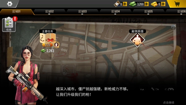 4、在游戏推进过程中,敌人的实力会逐渐增强,此时可点击右下角的【点击继续】来升级武器。