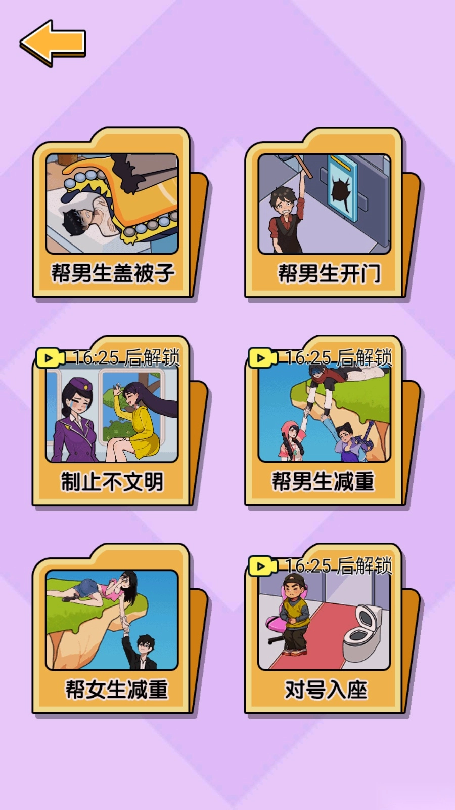 老铁动动脑吧为玩家提供了丰富的小游戏,进入游戏就可以选择热门的关卡开始挑战,可以在游戏选择帮助男生盖被子,可以选择帮助男生开门,可以选择帮助女生减重,提供的游戏关卡还是非常多的,点击任意游戏关卡就可以开始挑战,玩家需要认真查看游戏画面中的各种道具,合理使用道具才能通过当前的关卡,还需要注意道具的使用顺序,部分关卡提供多个单独的道具,如果使用顺序不正确也是无法通过关卡的;老铁动动脑吧提供的小游戏都可以免费使用,不需要购买道具,不需要充值,需要就吧。
