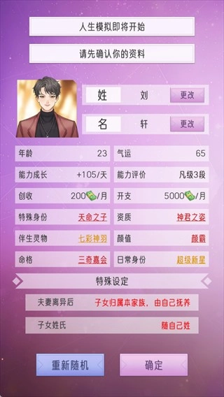 进入游戏后,首先要确认个人资料,其中涵盖姓名、年龄、气运、能力成长等各项属性,同时还能挑选特殊身份、资质等相关设定。完成选择后,点击【确定】按钮即可正式启动游戏,你的任务是创建豪门世家、在上京地区称雄、打造延续百年的辉煌荣耀。