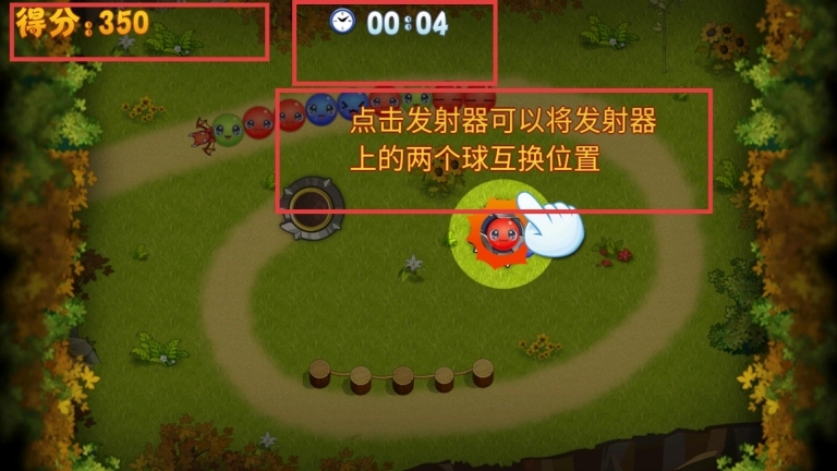 1点击发射装置能交换其顶部两个球体的位置,发射小球后可消除颜色相同的小球,消除成功会得到对应的分数。