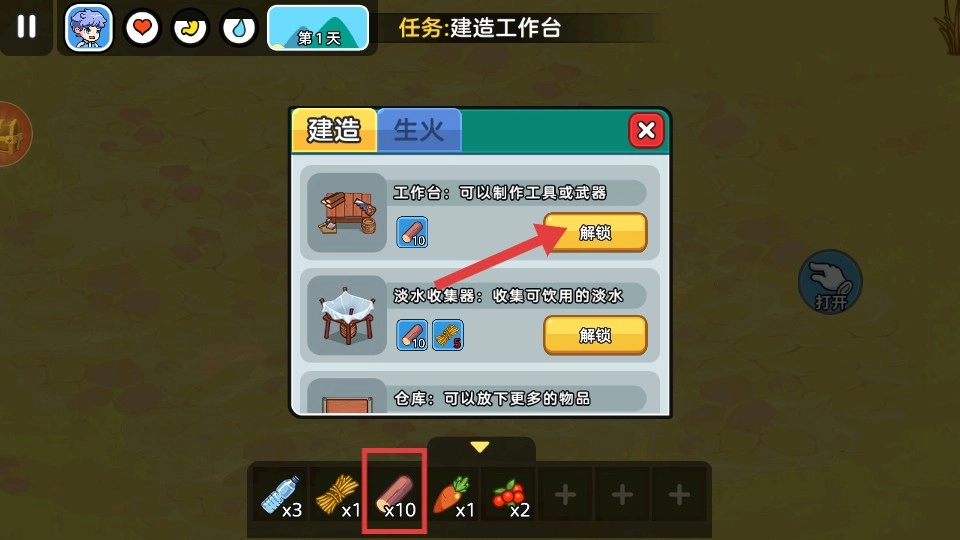 3、进入建造界面后点击【解锁】按钮开启工作台,消耗对应资源,以便为后续制作工具做好准备