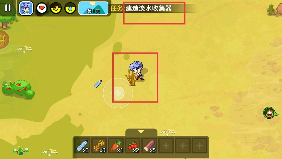 4、在完成工作台的建造后,接下来要推进【建造淡水收集器】的任务,需要收集好所需的各类资源,以此来保障生存需求。