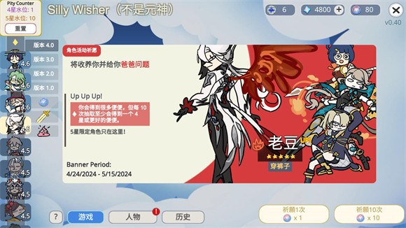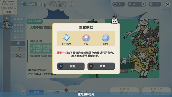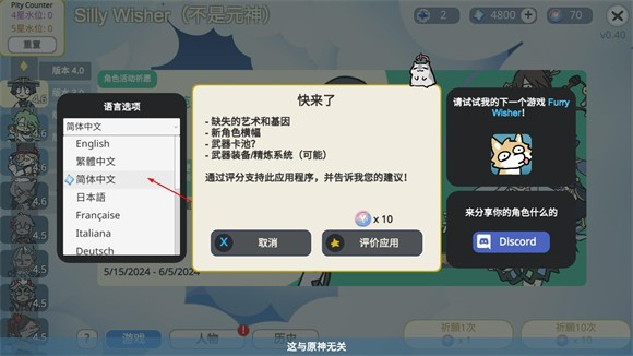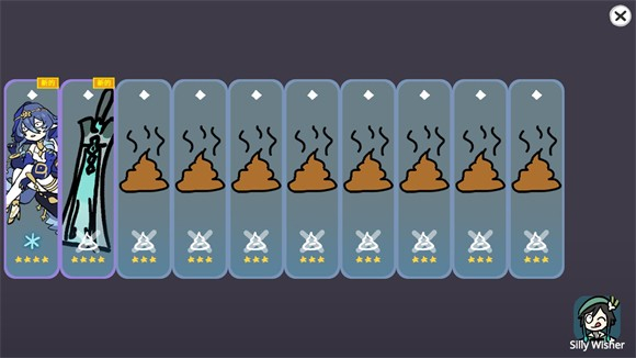 SillyWisher最新版是B站UP主【sketchi】自制的一款原神模拟抽卡小游戏,它的中文名叫做“不是元神”。这里涵盖了自原神开服起各个版本的卡池,每个版本卡池中的角色都不一样,不过整体的出卡概率、出金概率都与原神完全相同,是真实概率抽卡。在Silly Wisher最新版里,你能免费抽卡,拥有用不完的原石,随意进行各种十连抽,借此看看自己究竟是欧皇还是非酋。