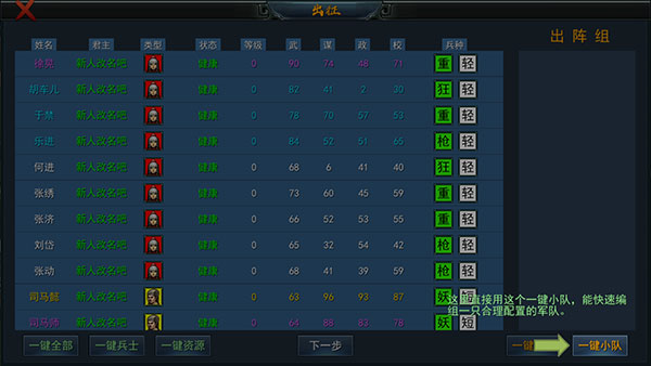 4招募完成后,可进入【军团编组】界面,手动把新获得的武将编入已有的队伍当中。
