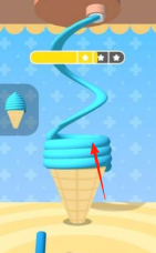 2操控蓝色物料,沿螺旋轨迹堆叠,复刻左侧甜筒冰淇淋模型的层数与形态。