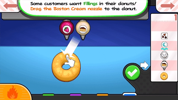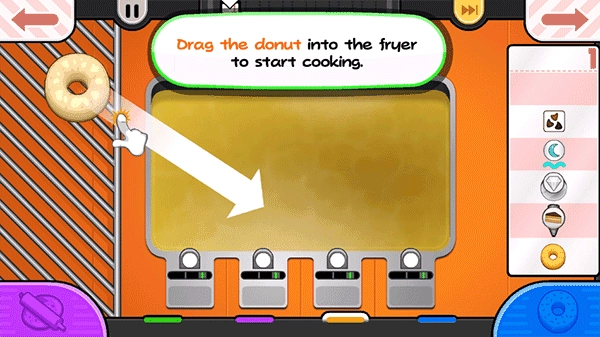 这是相当关键的一步,玩家的甜甜圈得经过油炸才能出炉,具体的油炸程度可以观察炉子中的计量槽,计量槽颜色越深就意味着甜甜圈越接近完成,特别要注意的是甜甜圈有正反两面,必须两面都炸到才行,此外还要记住不能炸太长时间。