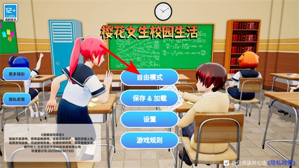 1、在游戏初始界面,勾选隐私政策后点击自由模式选项进入玩法,这是开启校园生活探索的基础步骤,在自由模式中体验各类校园互动。