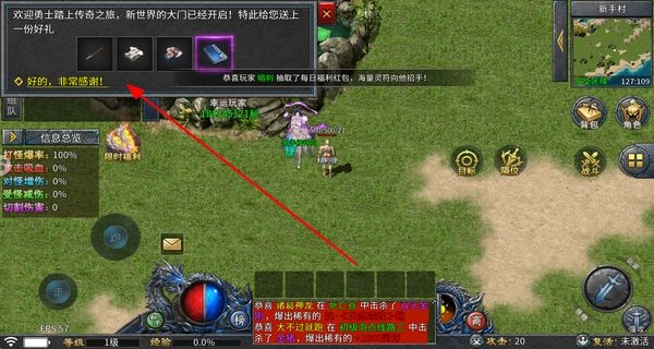 1、进入游戏后会收到新手好礼,点击对应按钮即可领取,领取后可获得初始道具,这些道具能帮助开启后续的冒险旅程。