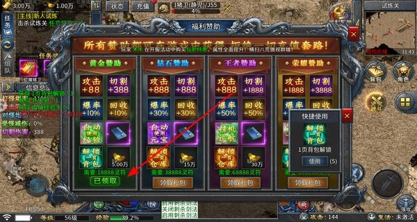 3、打开福利赞助界面,领取对应赞助礼包,礼包能解锁背包等功能,还能获得攻击切割等属性加成,助力提升战斗实力。