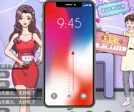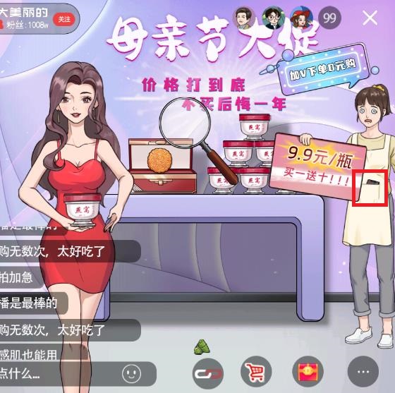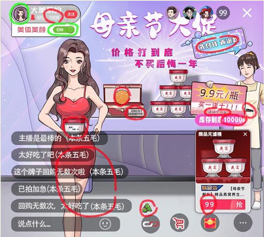 4、拖动放大镜,依次对准月饼盒、标注“库存仅剩”的区域、“9.9抢”的标识、主播手机展示的商品、写着“加V下单0元购”的提示、标有“买一送十”的牌子以及水军弹幕进行操作。